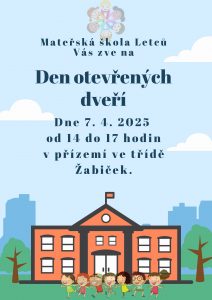 dovolte nám pozvat Vás na Den otevřených dveří, který se bude konat v naší mateřské škole v pondělí 7. dubna 2025 od 14:00 – 17:00.